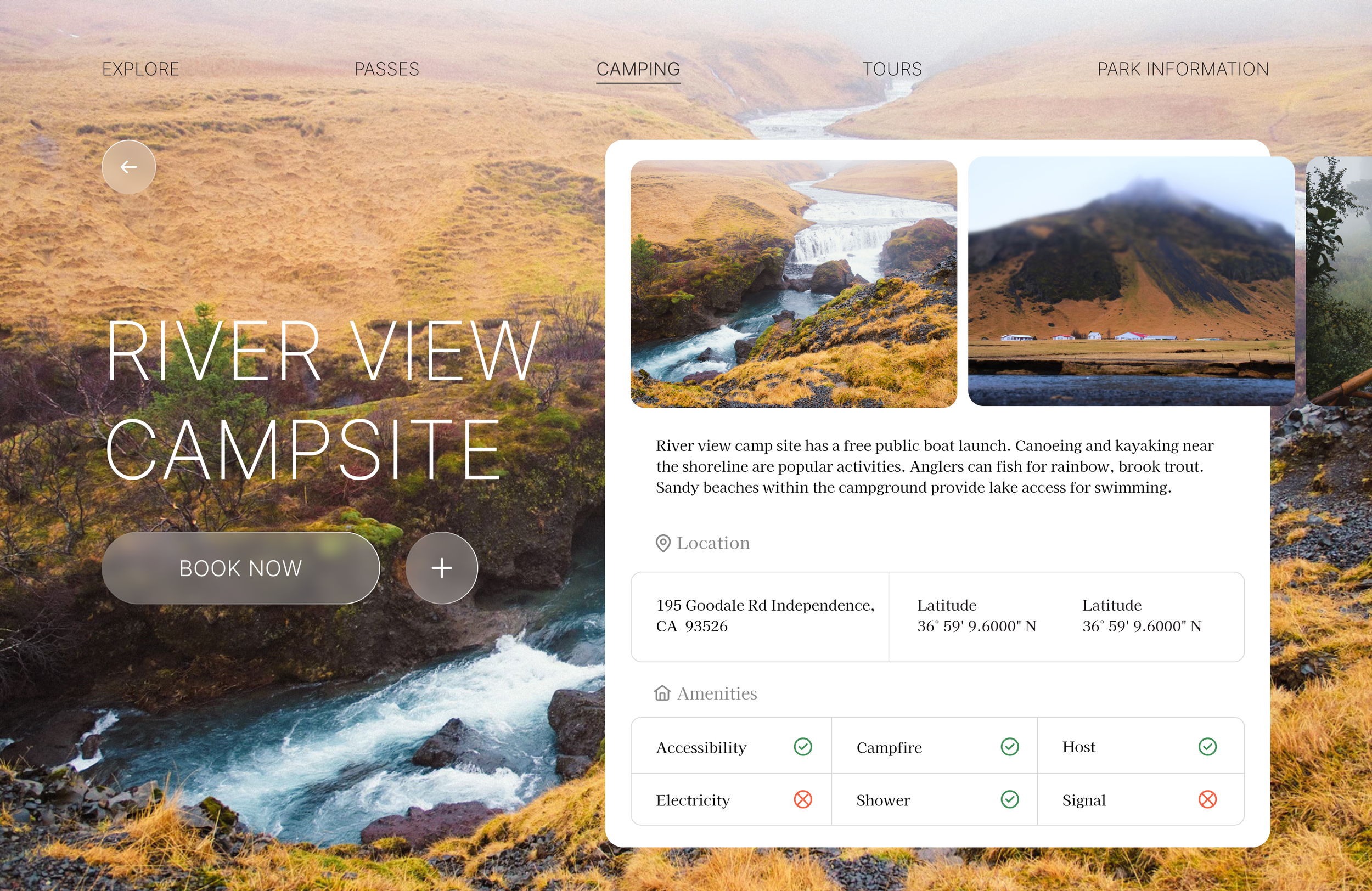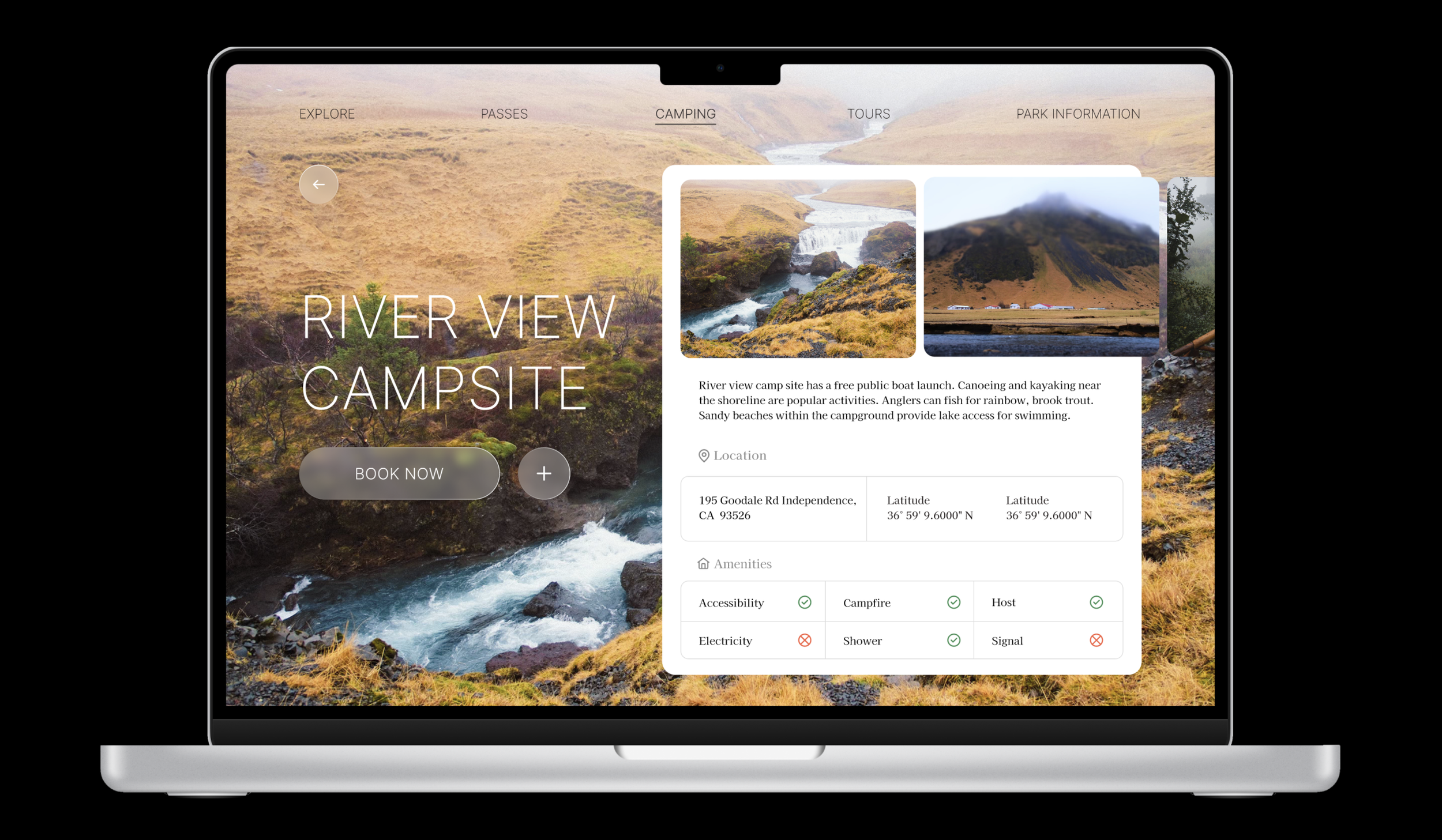 A campsite booking experience that puts key amenities front and center, framed by immersive nature imagery —making your next outdoor escape simple, intuitive, and inspiring. 🌿